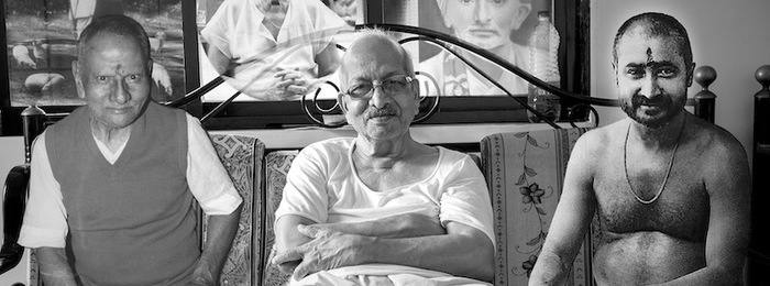 Photomontage avec Sri Ramakant Maharaj entouré de son Maître Sri Nisargadatta Maharaj et du Maître de son Maître, Sri Siddharameshwar Maharaj.